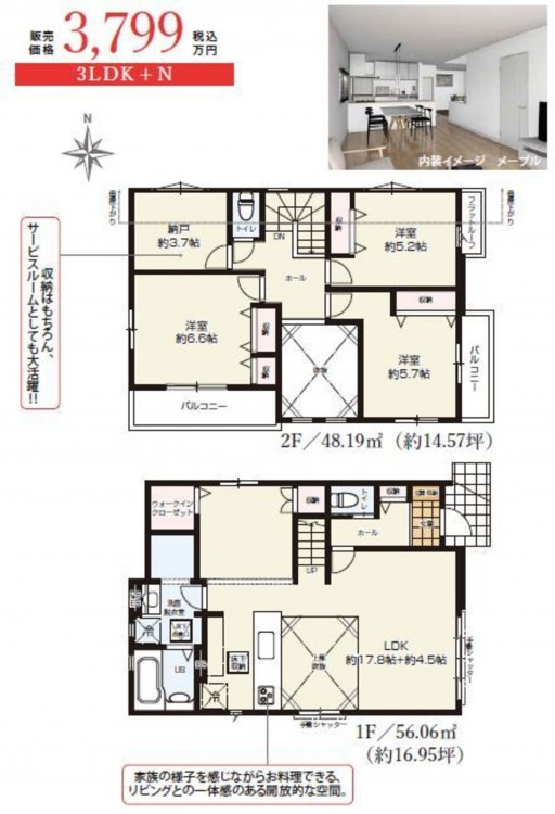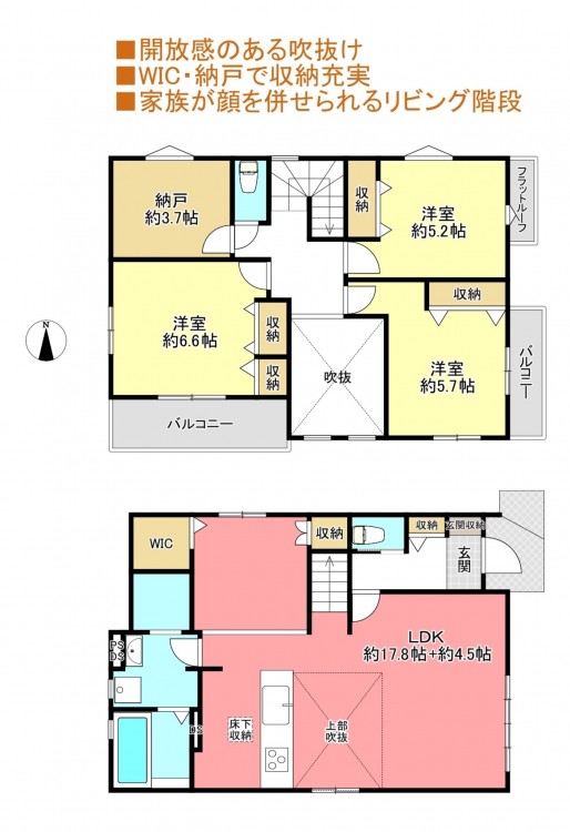 - システムキッチン、食器洗浄乾燥機、浴室乾燥機、追い焚き、ウォークインクローゼット、モニタ付インターホン、ペット可、1BOX駐車可、駐車場2台分、床下収納、トイレ2箇所