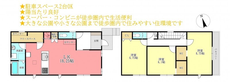 - システムキッチン、シャンプードレッサー、洗浄便座、浴室乾燥機、追い焚き、複層ガラス、CATV、CS、モニタ付インターホン、ペット可、床下収納、トイレ2箇所