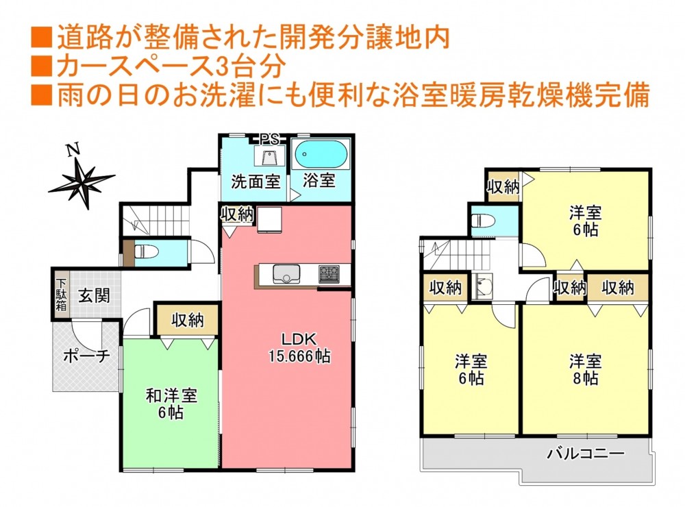 - システムキッチン、洗浄便座、浴室乾燥機、追い焚き、複層ガラス、モニタ付インターホン、ペット可、1BOX駐車可、駐車場2台分、駐車場3台分、トイレ2箇所